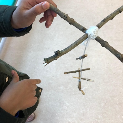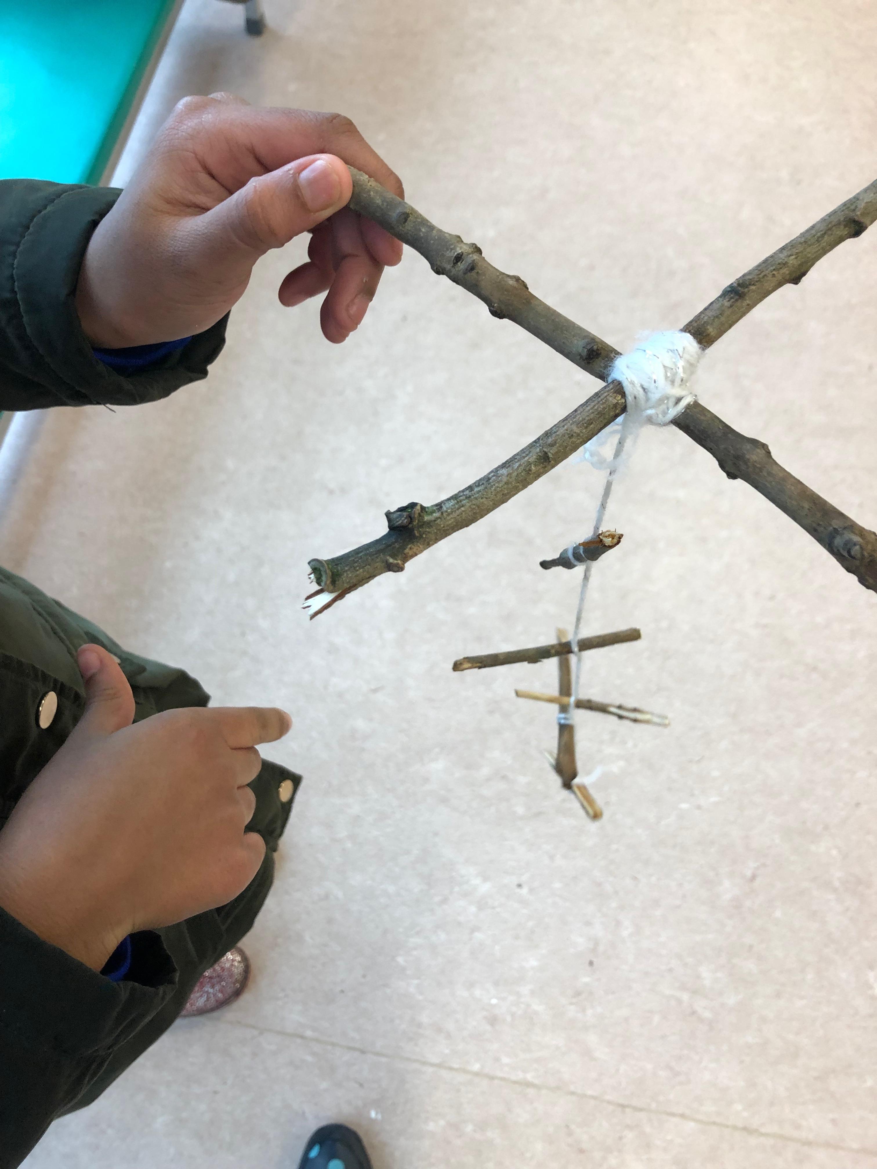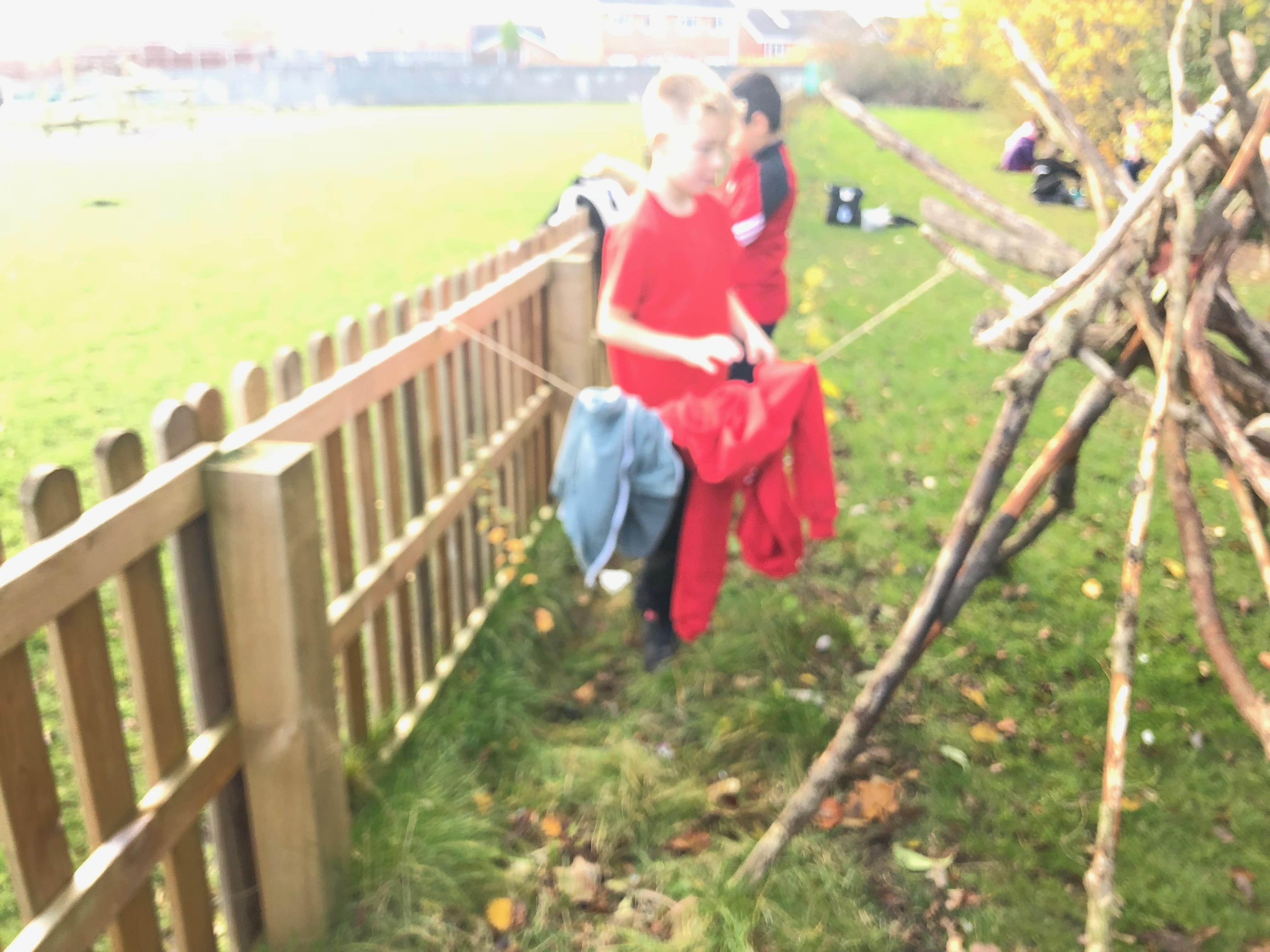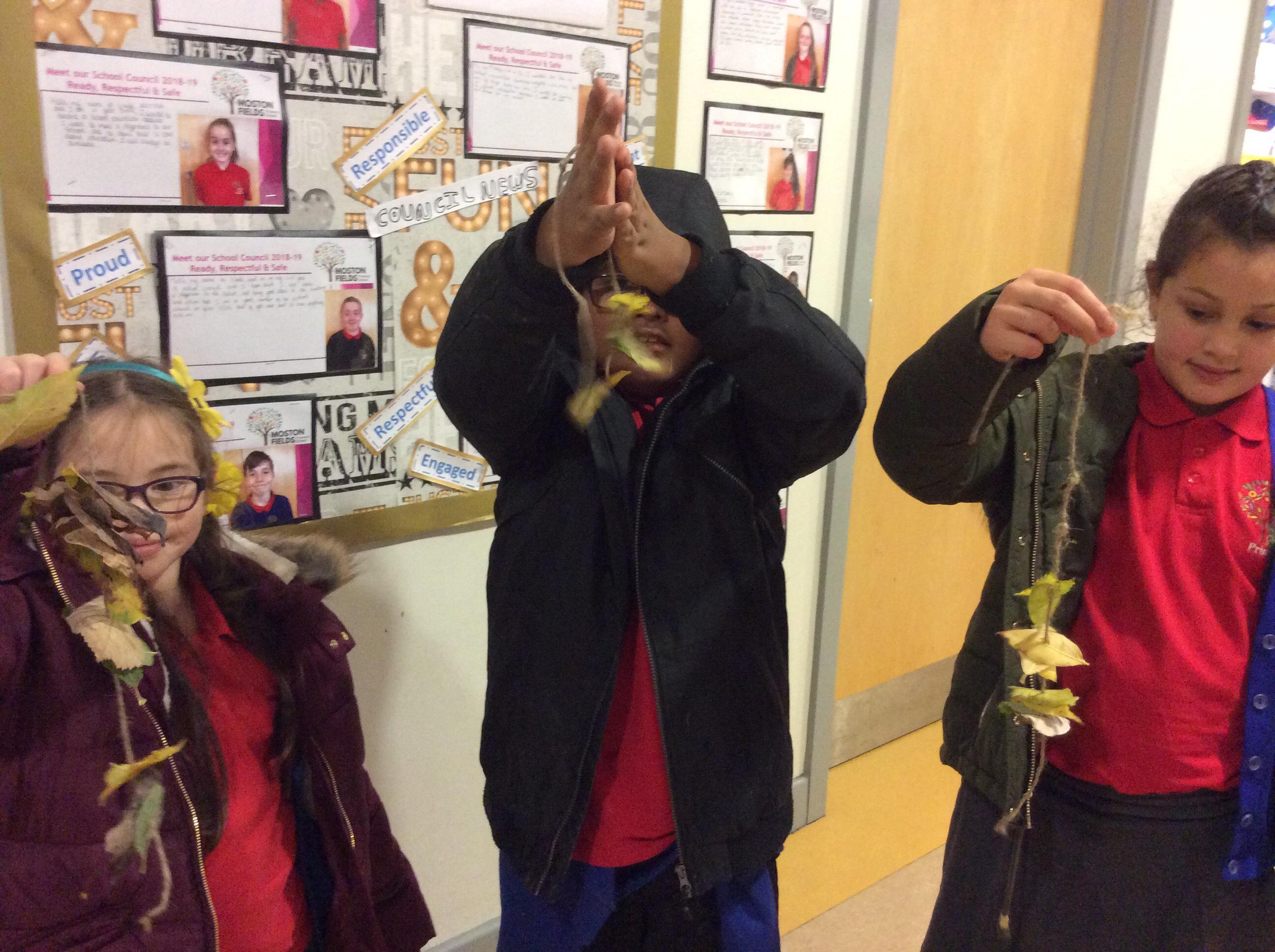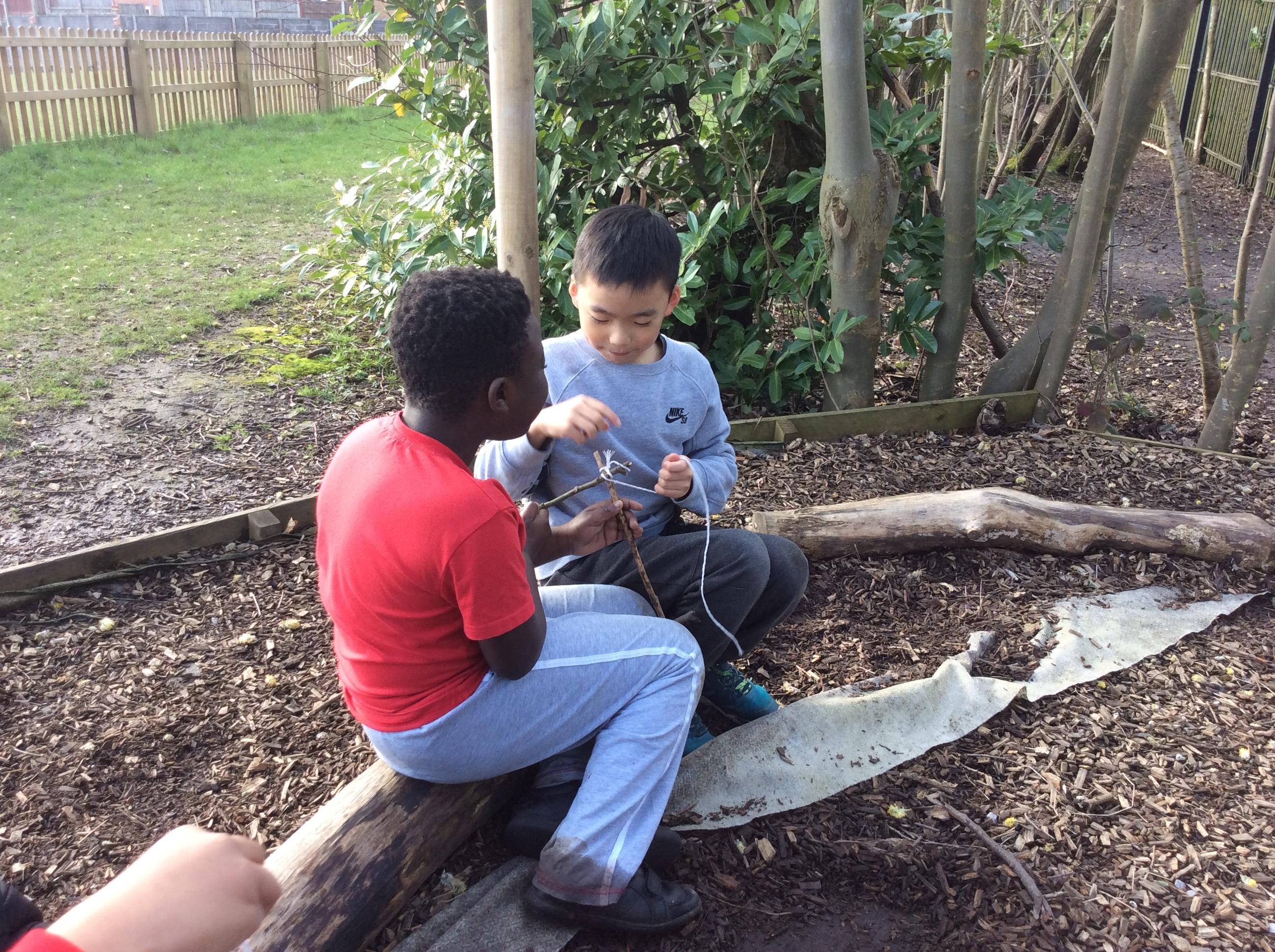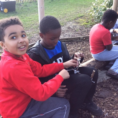 We created our own tools to make Autumn leaf bunting and practised tying simple knots.